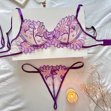Girls Underwear Suit, Embroidered Butterfly Steel Ring Underwear, Wine Colors Fashion Sexy Bra Panti Suit
