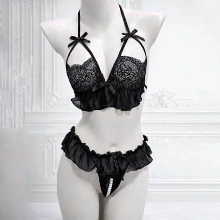 Sexy Lace Temptation Three-point Bra Open-file Uniform No-take-off Pajamas Women’s Suit
